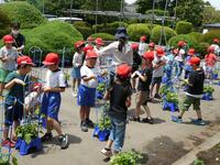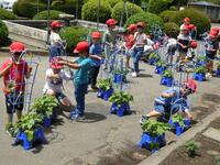 益子町人権擁護委員の先生方が来校され、日々草&ペチュニアの花苗やプランター、培養土等一式を贈ってくださいました。(人権擁護委員の先生はお二人とも七井在住の元校長先生でしたね。)