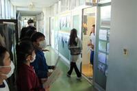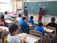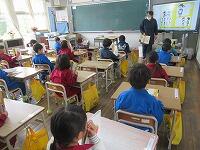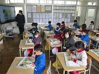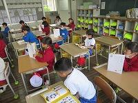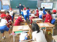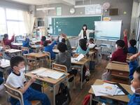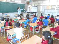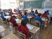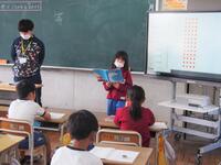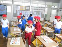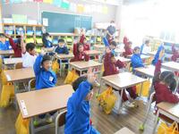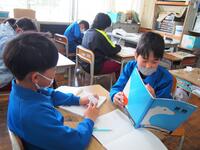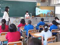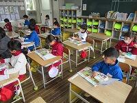 1時間目、1組は国語で自己紹介の練習をしていました。「私は、○○です。好きなものは、○○です。」と、一人ずつ自分の名前と好きなものを発表していました。2組は算数で、2つの絵を比べ、数に注目して違いを見つけていました。左側の絵の鳥の上におはじきを置き、右側の絵の鳥におはじきを移すことで、鳥の数が増えたのか、減ったのかを確認しました。