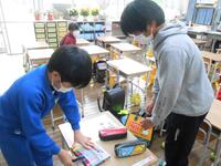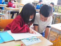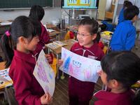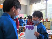 国語の授業では、昨日作成した自己紹介カードを使って、互いに名前と好きな物を伝え合いました。どちらのクラスも友達の輪がどんどん広がっていますね。(作品中の名前や名札等は個人情報保護のために修正を加えています。)