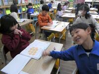 1-1外国語活動「えいごでかずをかぞえよう」、◇1-2算数「大きなかず」、4-1国語「テスト&復習」、4-2国語「調べたことを報告しよう」、◇6-2国語「さまざまな生き方について考えよう」の授業の様子です。