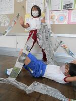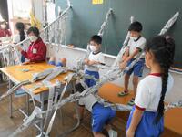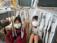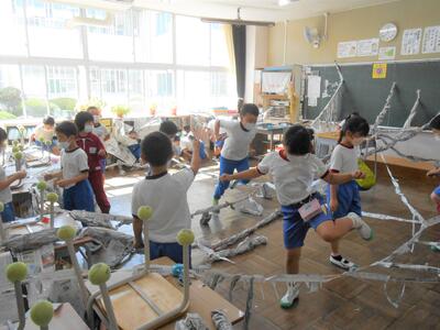 2-1図工「つないでつるして」教室内が大迷路?スパイダーマンの家?お化け屋敷?かと思うくらいの創意あふれる合作でした。