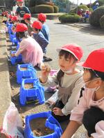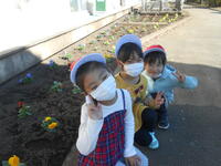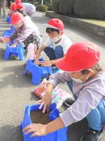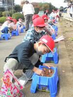 1年生は生活科で球根植えをしていました。チューリップや水仙やヒヤシンスなど、いろいろな春の花の球根を植え付けていました。