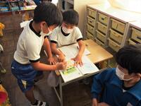 1-1国語「はっけんメモをかこう」発見した場所や様子(色、形、大きさ、さわった感じ、聞こえたこと)などを記録する学習です。カナヘビやバッタを捕まえ、リアルスケッチをしていた子もいました。