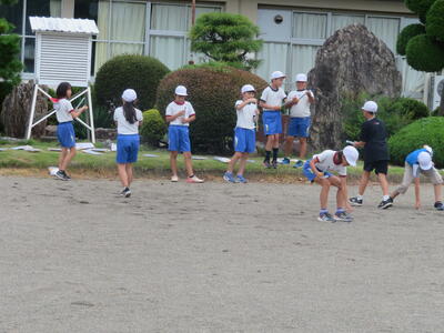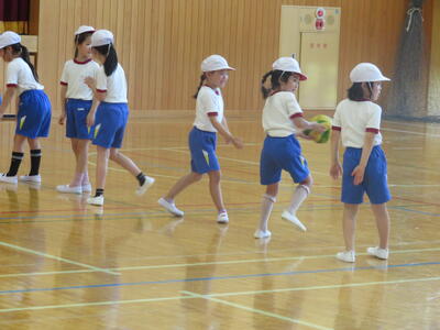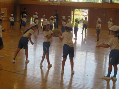 2年生体育 ボール送り運動を行っていました。「列ごとに、前から後ろの人にボールを送り、一番後ろの人は、走って先頭にボールを届ける」といった運動です。