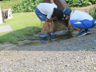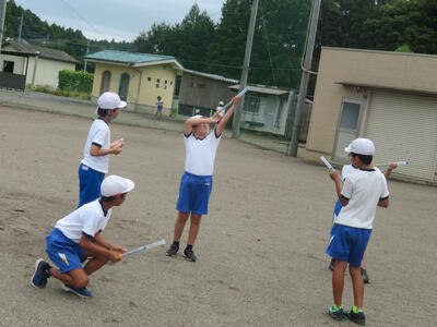 本日は、校庭で空気でっぽうを使用していました。筒に前玉と後玉をつめて、押し棒で押すと「前玉が後玉に触れてないのに、なぜ飛び出すのだろう」という問いをもちながら、空気でっぽうを飛ばしていました。