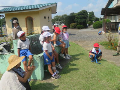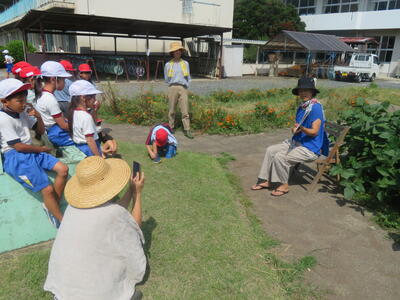 食育菜園ボランティアの皆様が、業間の時間に、「大豆の観察と青空読書会」を開いてくださいました。