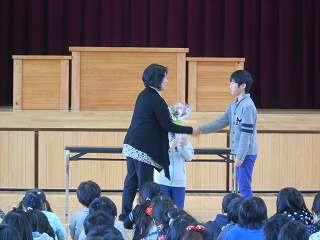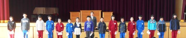 賞状伝達がありました。校内マラソン大会、バレーボール大会、町児童生徒連絡協議会標語コンクールの表彰を行いました。