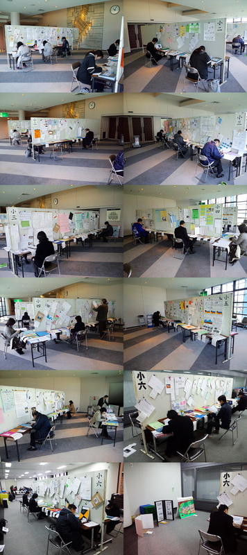 益子町民会館で開かれている理科展の様子です。出品した全部の作品を丁寧に審査しました。