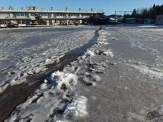 昨日の雪が凍って、道路や校庭がつるつるになってしまいました。特に校庭は、一面が氷になって子供たちは歩くことができませんでした。幸い、登校時に転倒してけがをする子はいませんでした。下校時も気を付けて歩いてほしいと思います。今日は5、6校時に自由参観があります。駐車場については昨日のメール配信でお知らせしたとおりです。校庭には駐車できません。どうぞよろしくお願いします。