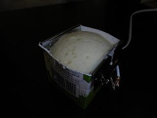 牛乳パックにステンレスの板を入れ、中にホットケーキのもとを流します。