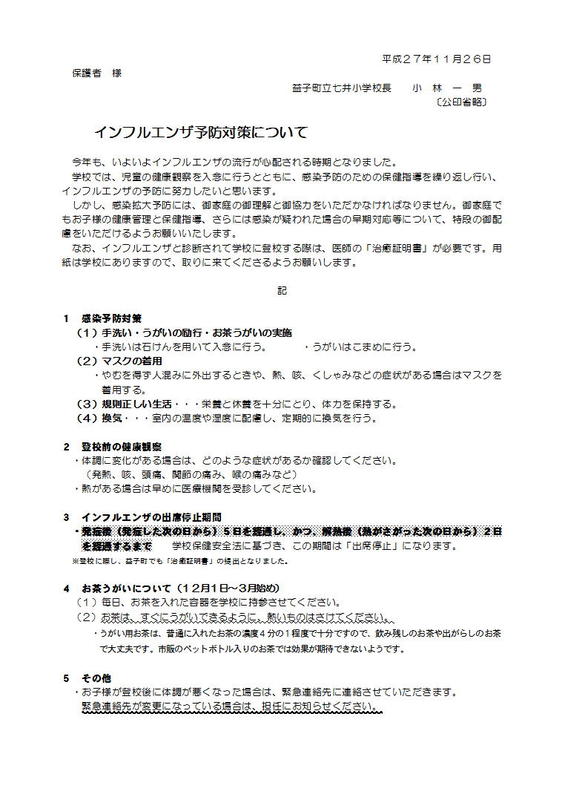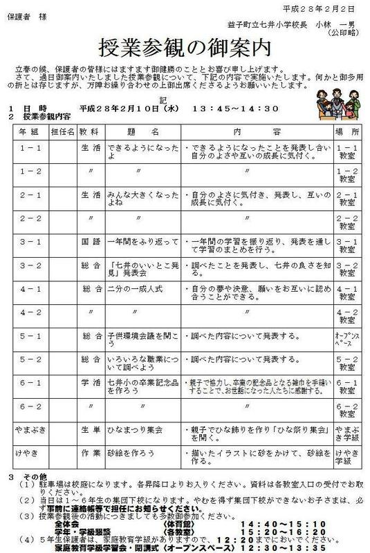 20日(水)ノーメディアデー、外国語活動1・2年、中学校入学説明会(七井中)13:10~13:25受付13:30~14:00授業参観、七井小同窓会役員会17:00会議室