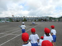 1年生の体育は、50メートル走やソフトボール投げを練習していました。数年後の陸上選手たちです。