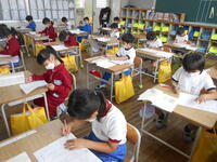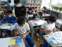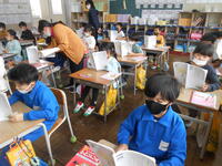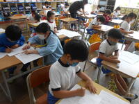 2年生が国語の時間に作文の清書をしていました。添削された下書きを見ながらていねいに書いていました。