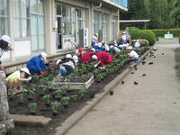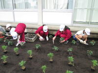 まずは3年生が夏の花苗(サルビア、マリーゴールド)を並べます。