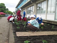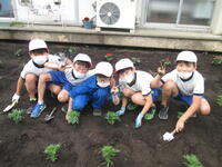 5年生が、理科実験で育てた植物(トウモロコシ、インゲンマメ)を畑に植えました。11日のHPで「発芽の条件実験中」の写真を載せましたが、結果、発芽の重要条件は“水”だったようです。“空気”や“温度”以上に水の有り無しは比較しやすかったとのこと。