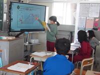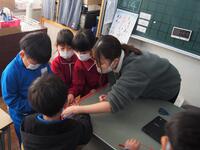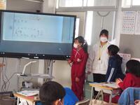 1-1外国語活動「1ねんかんのまとめ」、1-2算数「くらべかた」、3-1理科「じしゃくのふしぎ」、4-1算数「小数と整数のかけ算、わり算」、4-2算数「小数と整数のかけ算、わり算」、5-2算数「四角形や三角形の面積」の授業の様子です。