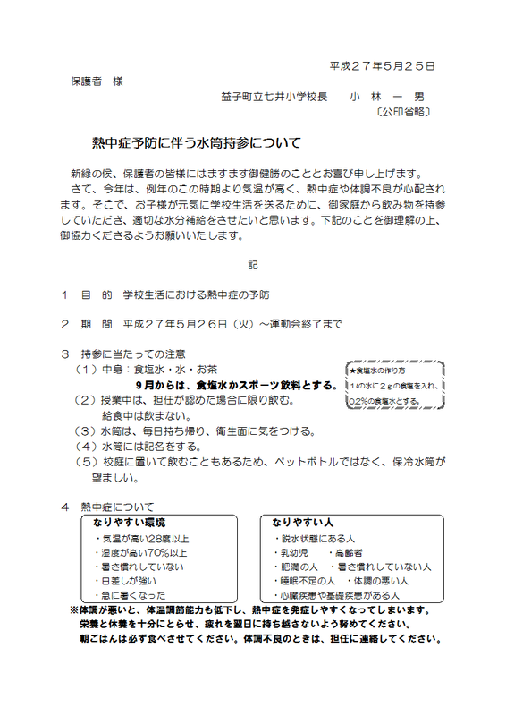 本日、通知を配布しました。明日から水筒持参となります。どうぞよろしくお願いします。