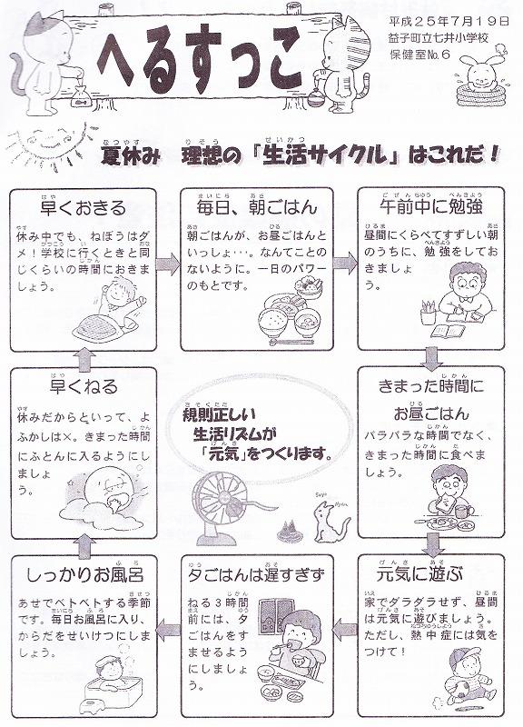 今週で夏休みが終わりになりますが、七井小の児童のみなさんは、規則正しい生活を送っていますか?保健だより「夏休み号」をもう一度見て、今週中に「自分の生活」を見直してみましょう。