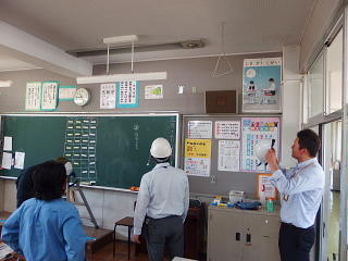 各教室に扇風機が設置されることになりました。教室の前と後ろの壁上部に合計4台設置されます。教育委員会と業者の方が教室を見に来ました。町内全ての学校に設置される予定です。七井小では4年生教室から配線工事が始まりました。