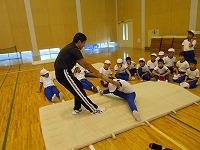 きょうは、4年生があぐり館でマット運動をしました。準備運動の後、広い体育館で前転、後転、開脚前転、開脚後転の練習をしました。