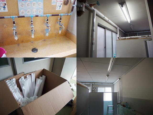 水道管工事が順調に進んでいます。天井付近の壁に新しい水道管を取り付けています。新学期には工事も完了し、蛇口も新しくなります。