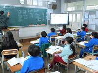 4-1算数「ふくしゅう問題」かけ算、わり算の筆算の問題です。8問パーフェクトに「よっしゃ~」の声。廊下には「いろいろな人の気持ちになって」という総合的な学習新聞が掲示されていました。