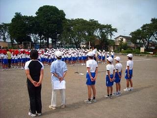 今日から、運動会の全体練習が始まりました。今日は、姿勢や服装(半袖・ハーフパンツ・赤白帽)などの確認や入場、ラジオ体操の隊形を練習しました。