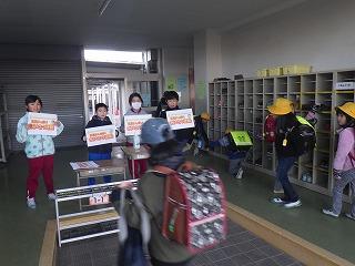 中学生と小学生が、昇降口であいさつを呼びかけました。