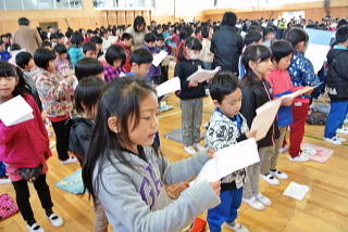 全校児童のワークショップ 「ひまわりのように」(本校児童の作詞・作曲)の歌を練習しました。