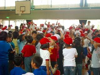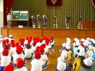 みんなの時間に音楽集会がありました。今日は「London Bridge(ロンドン橋)」を英語で歌いました。みんなで橋を作って歌いながらくぐったりしたので楽しかったです。また、1年生がしっかり覚えた校歌を、みんなの前で大きな声で歌ってくれました。