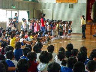 みんなの時間に音楽集会がありました。今日は「London Bridge(ロンドン橋)」を英語で歌いました。みんなで橋を作って歌いながらくぐったりしたので楽しかったです。また、1年生がしっかり覚えた校歌を、みんなの前で大きな声で歌ってくれました。