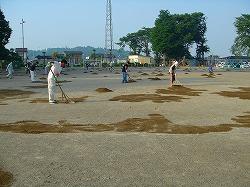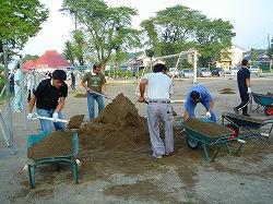 校庭への砂入れ 雨が降っても水たまりができなくなります。