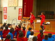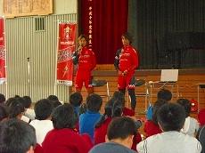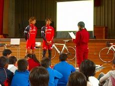 5時間目に自転車教室がありました。今回は栃木県のプロレーシングチーム『宇都宮ブリッツェン』の廣瀬キャプテンと若杉選手から、自転車の歴史やロードレースについて、自転車の安全な乗り方などについての講話がありました。カッコイイ自転車にまたがって、颯爽と登場した2人に、子どもたちの目はくぎ付けでした。日頃、練習をしている中で感じている、自転車の危険性や事故にあわない安全な乗り方について、具体的な話を交えながらわかりやすく教えてくれました。質問コーナーでは、ロードレースで使っている自転車についていろいろ教えてもらったり、6年生の代表が実際に乗せてもらったりしました。カーボンでできていて、重さが7kgぐらいしかないことや、タイヤが簡単に外せることなどビックリすることばかりで、みんな大興奮でした。