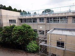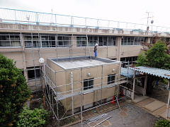 夏休み、前校舎の壁を塗装します。塗装の準備として、校舎の周りに足場が組まれました。児童のみなさんは、危険ですから足場の近くに行かないようにしましょう。