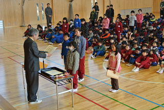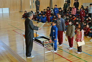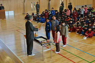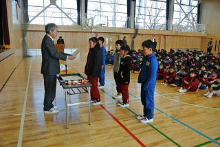 賞状伝達がありました。芳賀地区理科研究展覧会と発表会、栃木県学校教育書写書道作品展、サッカー部芳賀オープン大会の表彰をしました。学習、運動と多くの分野で活躍している七井小の子どもたちです。