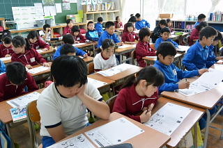 毎週水曜日のチャレンジタイムは全校一斉作文タイムとなっています。絵に描かれていることを文に表すなど、楽しい活動を通して書く力を伸ばしています。