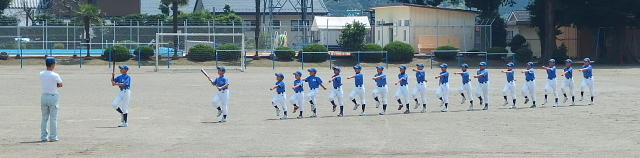 7月26日(土)から始まる第45回県学童軟式野球大会の入場行進の練習を一生懸命頑張っていました。大きなかけ声とともに足が高く上がり、見事な行進でした。七井クラブは初日7月26日(土)に壬生の稲葉クラブと対戦します。場所は小山運動公園B球場です。優勝を目指して頑張ってください。