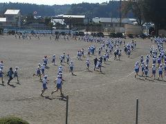 学年別に準備体操した後、トラックの内側から低学年、中学年、高学年に分かれて走りました。