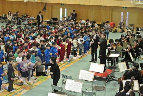 また、本校児童が作詞作曲した「ひまわりのように」もオーケストラの伴奏で全校生で合唱することができました。最後のアンコールはなんと、七井小の校歌をかっこいいオーケストラバージョンにアレンジしたものでした。大きな声でオーケストラと一緒に歌うことができました。プロの演奏家のみなさんと、七井小全校児童が一体となった心温まる演奏会が実施できました。お越しいただいた保護者の皆様にもたいへんお世話になりました。七井小校歌オーケストラバージョンのCDは神奈川でレコーディング、CD化して後日、七井小に送っていたけるとのことでした。神奈川フィルハーモニー管弦楽団のみなさん、今日はありがとうございました。