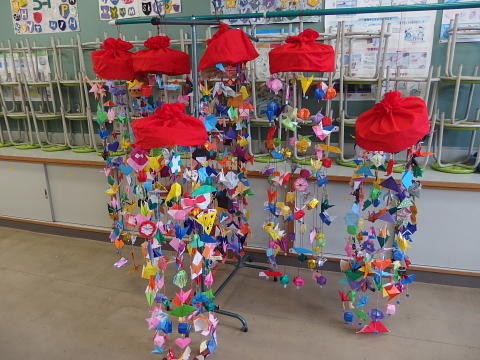 全校児童で作った「つるしびな」ができました。折り紙で作った「つるしびな」です。学年で1つの「つるしびな」を作りました。赤い帽子をかぶって、愛くるしいおひな様になりました。2月1日から開催される「益子の雛めぐり」で飾られます。ぜひ見に行ってください。
