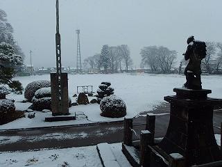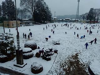 朝から雪が降り続いています。校庭が真っ白になりました。