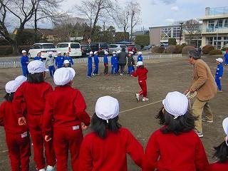 今日の体育集会はクラスごとに大縄を跳びました。担任の先生や友達に縄を回してもらいながら、楽しく跳ぶことができました。