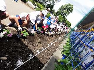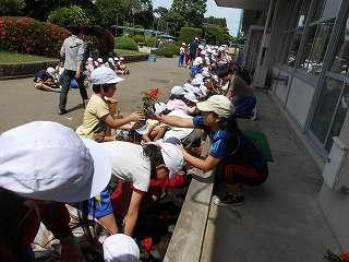 2時間目に全校児童で「花の苗植え」をやりました。1年教室前花壇、職員室前花壇、保健室前花壇、2年教室前花壇にパンジー、マリーゴールド、日々草の花を植えました。心をこめてていねいにやさしく植えました。先日いただいた人権の花も一緒に植えました。花や友達を大切にするやさしい子が七井小にたくさん増えてほしいと思います。