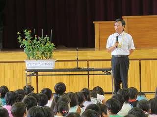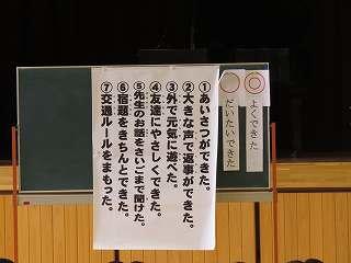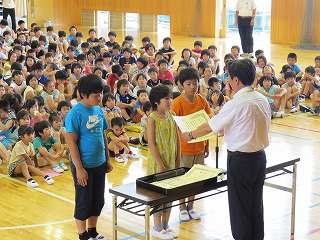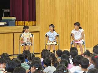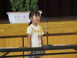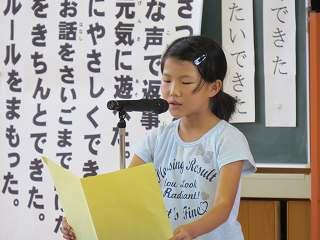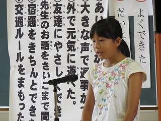 児童代表の作文発表では、1年生、3年生、5年生の3人の子が作文を発表しました。3人とも1学期に頑張ったことや夏休みの抱負を自分の言葉で大きな声で堂々と発表することができました。