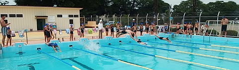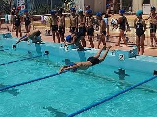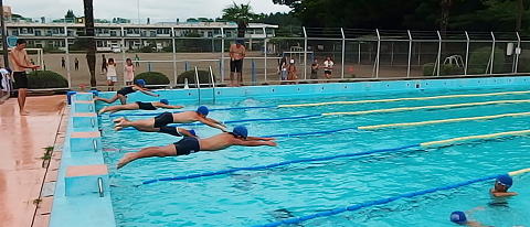 町水泳記録会に向けての練習が今日から始まりました。今日は飛び込みの練習をしました。今日の参加者は41名でした。合唱部と兼ねている子もいます。水分補給をしながら頑張っていました。