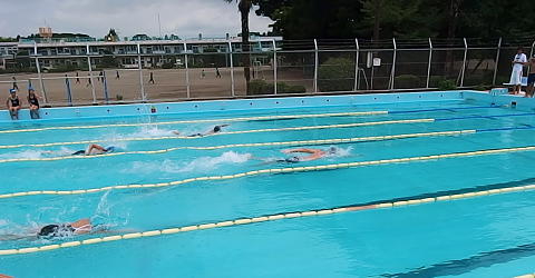 今日は夏休み2回目の水泳練習を行いました。さまざまな種目の記録を計りました。最後に、自由形リレー(25m×4人)とメドレーリレー(背25m1人、平泳ぎ25m1人、バタフライ25m1人、クロール25m1人)の記録も計りました。6年生男女2チーム、5年生男女2チームが対戦しました。今日は2年2組の先生も一人で100m自由形リレーと100mメドレーリレーを一緒に泳いでくれました。水泳部だった先生は泳ぎがとても上手でした。先生に勝とうとみんなチームの力を合わせて頑張っていました。