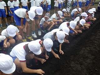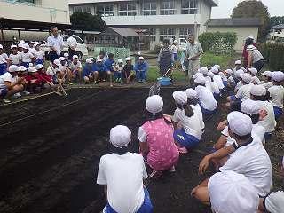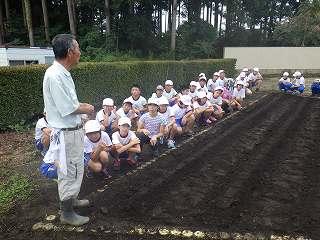 今日は、6年生と2年生が教材園に大根の種をまきました。