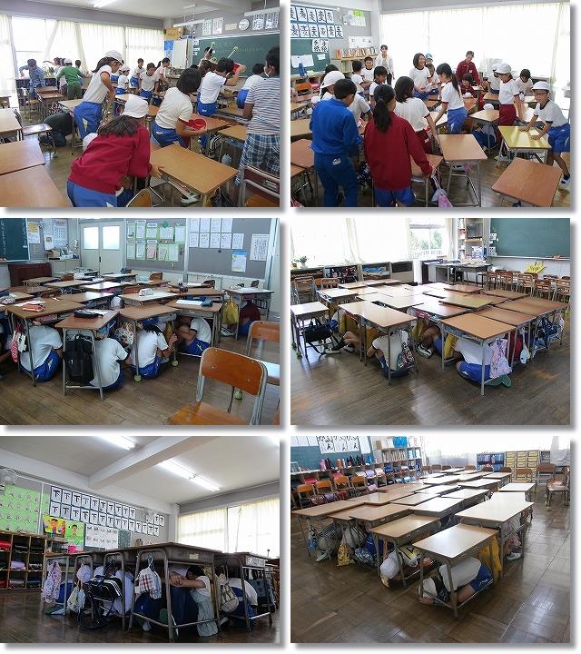 カーテンを閉め窓から離れ、教室の中央に机を寄せて避難する訓練をしました。