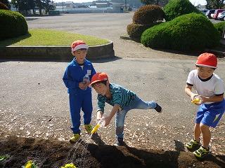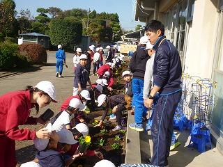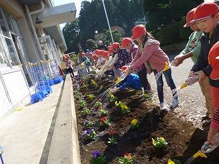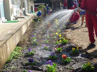 4年生と6年生がパンジーをきれいに植え、1年生が水やりをしました。