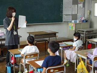 メッセージの内容を説明している様子です。1年生も6年生も、大変熱心に話を聞きました。